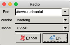 In Macs, double click the CHIRP Icon to open it. You might get a pop up that the developer cannot be verified or is unsigned. Click cancel, then while holding down the control key, click the CHIRP icon once then click open at the top of the pop up. You might have to click the icon while holding the control key down a few times and then open in the pop up to get it to open. It may ask for your user ID and password to add chirp and/or drivers to the permitted apps - go ahead and do that the same way you do when you start up your computer. Once you have gotten the CHIRP screen to open, you won't have to go through the control key procedure again. In Windows, search for CHIRP which is likely in Program Files or your Download folder, and open it. Using CHIRP Turn the radio on then turn the volume control to minimum. In the Chirp top menu, select Radio, then Download from Radio. If not, select the Vendor and Model. UV-5R works for the UV-5R3 also. Any time you plug in a different model radio for the first time, you need to do the Download from Radio so that CHIRP recognizes the radio's firmware version. If the Cloning popup does not appear, turn off the radio and then back on. Most newer operating systems will automatically find the right com port when it is activated by the device being plugged into it, but some need to be reminded by unplugging the USB cable and plugging back in. When you get the popup, click OK. In Windows, you may have to try selecting other COM ports.