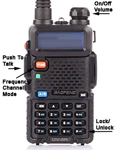 It is a good idea if on a run to lock the keyboard so you don't accidentily punch a button and throw it off channel. Hold down the #/lock key on the bottom right until you hear "China Girl" say "lock." Hold down again to "unlock" when you want to change channel. In Frequency mode (VFO - Variable Frequency Oscillator), this is used to punch in the 6 digit frequency for a repeater or simplex that is not programmed in to Channel memory that you want to receive. This is OK for monitoring for now, but we can get into using this later after you have had some experience because it involves using the menu button to add in the Tone code and repeater offset before you can transmit. However, it is much simpler to program new frequencies you will use again on the computer and upload to your radio. The program I use to initially program your walkie talkie is called CHIRP. The download is free and makes it easy for you to reprogram your radio with changes or additions. There is much more to this radio, but these are the basics to get you started. With its 4-5 Watts output, this radio will do everything you need on the most used 2 meter (144 MHz) and 70cm (440 MHz) ham bands in the area. The newer UV-5R3 version will also work on the 220 MHz ham band. For more descriptions of the buttons and functions of this radio, see page 8 of the UV-5R Manual.