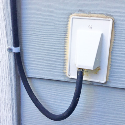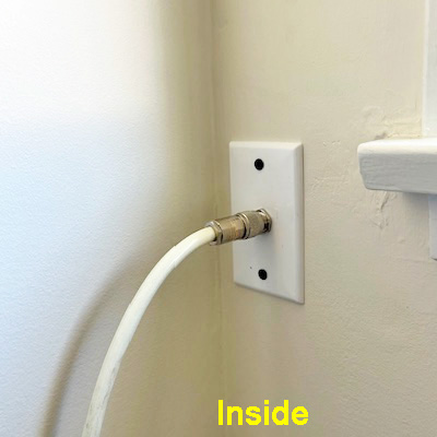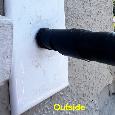 Getting the Coax into the house - Yes, the best way is just to bite the bullet and drill/cut a hole in the wall vs. trying to find a vent under the eves and then go up in the attic to drill a hole in the ceiling above the ham operating position. It is really not that hard. Go to Home Depot and get a 3/8 masonry drill bit and a drywall saw. Find a spot between the studs with a stud finder or take a guess by the old tap method. Make sure no wall sockets are on the inside wall within the width between the two studs. After marking the outline on the outside wall, (inside of the mounting bracket) drill out an upper corner just inside the line all the way through to the inside wall. Cut just outside the line with the drywall saw. Mark and cut the inside wall hole. If you are in to tools, you can also use an Oscillating-Multi-Tool. See Tom for the Cable Entry Fixtures. Click video and info for a video on installing the Arlington CE-1 Cable Entry Fixture and LV1 Low-Voltage Mounting Bracket. The wall fixture opening points outward and down as shown in the photo above, not inward, and put some adhesive sealant under the top and sides.