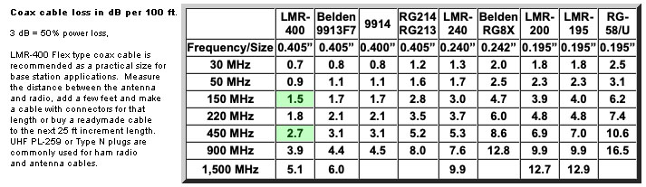 Coax Cable - CNT-400 or LMR-400 are special low loss 50 Ohm cable that is 4/10 inch diameter and connects the antenna on the roof to your radio inside the house. At VHF and especially at UHF frequencies you can lose almost half (2.7 dB) of your RF power per 100 ft with this coax cable. So measure the distance with a string then select the next longer 25 ft incremental length. Ideally to minimize cable loss, the coax is cut to the minimum necessary length and connectors are then put on, but that involves soldering and proper assembly. The suggested ready made coax source is Ham Radio Outlet in Anaheim using Andrews Cinta CNT-400 low loss coax.