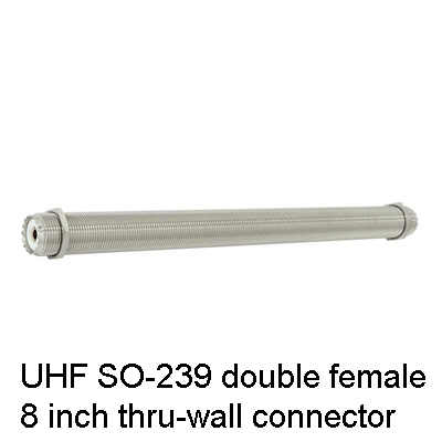 An alternative is is to use an 8 inch double female SO-239 connector. A coax cable is run from the antenna to this connector and another coax cable from the radio to the connector on the inside wall. Drill one 5/8 inch hole through from the outside wall with a masonry bit, and make sure no electrical wires are in the way. Two Blank wall plates are also drilled with a 5/8 inch hole in the center. A large 5/8 id flat washer is used as a spacer between the plate and the wall on each side. Push the 8 inch connector through the plate, washer and then the inside wall leaving at least 3/4 of an inch between the end and the nut. Square up the inside wall plate and use 2 #6 flat head wood screws to keep the plate from rotating - snug, not tight. On the outside, put adhesive sealant around the hole and no more than 1/4 of an inch out on the connector. Put sealant on the washer and push it up to the wall over the connector. Adhesive sealant goes all over the inside of the wall plate from the top, sides and around the hole. Place slide over the connector and against the wall and tighten the connector nut on the outside while holding fixed the inside nut. Wipe off all exposed sealant. After attaching the outside coax cable, wrap and completely cover the connector with electrical tape to prevent moisture from getting in.