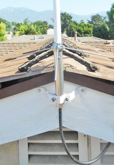 Antenna Mounting Bracket - The bracket clamps to the bottom of the antenna and bolts just below the peak of the roof with supplied wood screws. Use a drill bit to make a pilot hole to minimize splitting the wood with the mounting screws. Place the bracket level and as high up as possible on the peak, then mark and drill the holes. Fasten the bracket and check for level as the antenna needs to be perpendicular to the ground for best omni directional radiation pattern on the horizon. One bracket is fine for this size of antenna, but you can put the second one directly below the first for added wind strength. Run the coax cable up through the antenna mounting sleeve and then connect the coax cable to the antenna. Water inside the coax can ruin it so put two wraps of electrical tape around the connector at the antenna starting on the coax, up the cable connector to the base of the antenna jack and back down again. Slide the sleeve up and fasten with the bolt. Mount the antenna to the bracket. Make a drip loop by bringing the coax back up and under the eves so as not to conduct water down to the wall entry. The cable can be routed under the eves and down next to windows for least visual exposure.