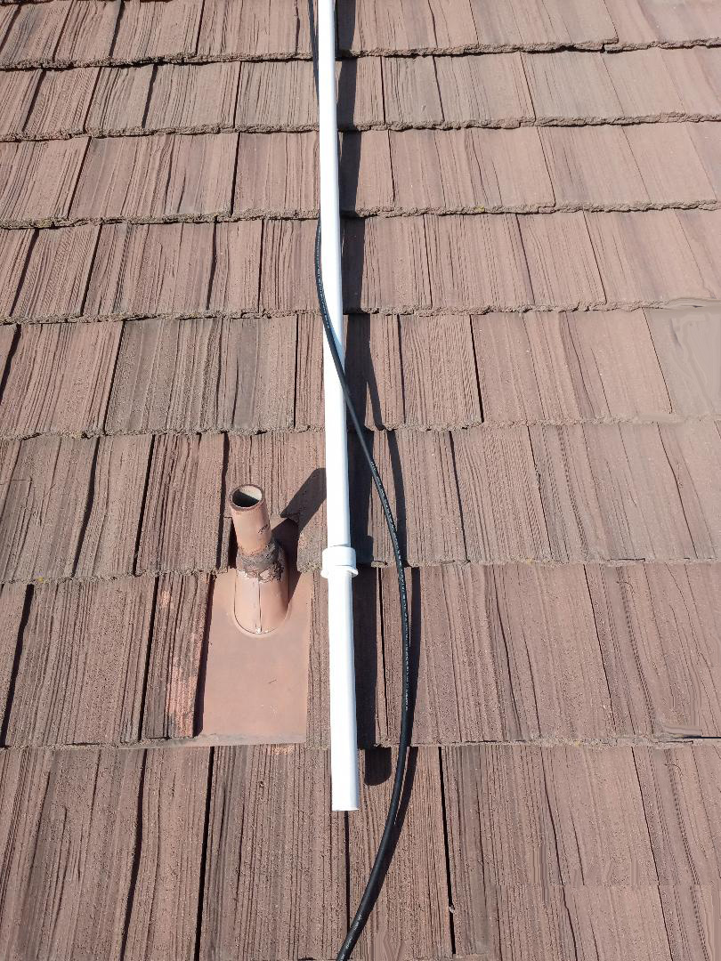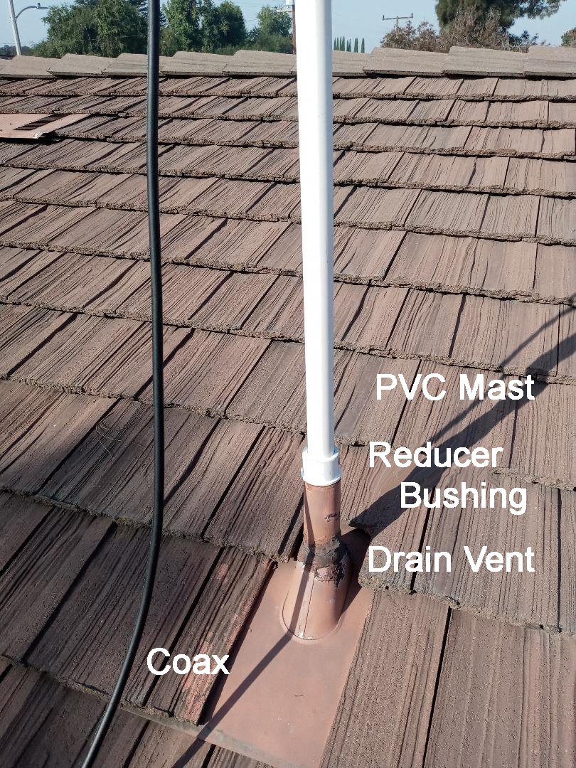 Drain Vent Pipe Antenna Mounting - Another easy way to mount the antenna on the roof, is to insert a mast made of 1 inch schedule 40 PVC pipe with at least 1ft inside the drain vent pipe. All homes will have drain vent pipes over the kitchen, bathrooms and laundry room. They are typically 1 1/2 inch inside diameter metal pipe which will accept 1 inch ID sch40 PVC pipe that has an outside diameter of about 1.3 inches. A 1-1/2 x 1 in.Reducer Bushing fitting is used to keep the pipe mast from going any further down the vent pipe - does not block the vent pipe, no holes to drill and it can just be lifted back out so Santa's sleigh doesn't hit it. The exposed mast section height is adjusted such that the bottom of the antenna is at least even with the top of the roof line and then the reducer bushing can be cemented in place. The reducer needs to be filed and sanded out so that it just slides over the pipe mast - see Tom for one.