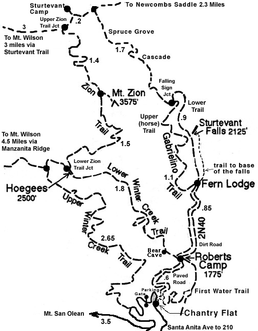 Chantry Flat is a great starting point for many runs and hikes depending on the distance or time you want to take. For the history and lots of information on the trails, check out the Santa Anita Canyon web site. A good short beginner route is about 3 mies round trip to Sturtevant Falls. The 5 mile Hoegees loop is popular for a taste of doing single tracks and rock hopping across a stream down a beautiful valley. The Mt. Zion Loop is a bit more challenging for 9 miles. If you want to do Mt. Wilson, many take the Sturtevant trail up and Upper winter Creek back for a round trip of about 15 miles. There is a good web site that has the mileage from Chantry Flats to various points on the trails - Sturtevant Falls, Mt. Wilson, Upper and Lower Winter Creek, Mt. Zion, Hoegee's...etc., check it out. Which ever trail you do, bring plenty of water, especially if it is hot, and some snacks as there is no place to replenish on the trail with the exception of Mt. Wilson. During the weekend, the parking lot fills up by 7:30am, so start early. Angeles National Forest and the Chantry Flats road is open but check the USFS web site for current information. A USFS Adventure Pass is required to park at Chantry Flat. The gate at the top of Santa Anita Ave opens at 6AM and closes at 8PM daily. Lots of good info on the Adams Pack Station web site about trails, history, etc., and is a good place to get a burger and a drink at the end of your trail. To get to Chantry Flat from the 210 Freeway in Arcadia, take the Santa Anita Ave off ramp and go all the way north into the mountains to the parking lot at the end. The club used to do an informal 9 mile Mt. Zion loop run/hike from Chantry Flats New Years Eve morning known as the Noiz Indian Run. Walkers start at 7:00 AM, joggers at 7:30 AM and runners at 8:00 AM so that all will regroup at Sturtevant Camp about 9:15 to get a drink from the fountain and try the tree swing. Then up to Mt. Zion for the fun Noiz Indian ceremony. At the finsh back at Chantry Flat you can pot luck or buy food from the Adams' Pack Station. |