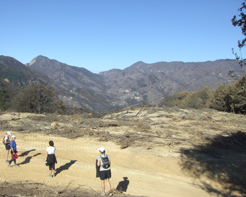 | View from Newcomb Saddle looking out toward Red Box. Left side shows control burn areas that kept the Station Fire from Mt. Wilson and the right side shows total burn along Hwy 2. |
