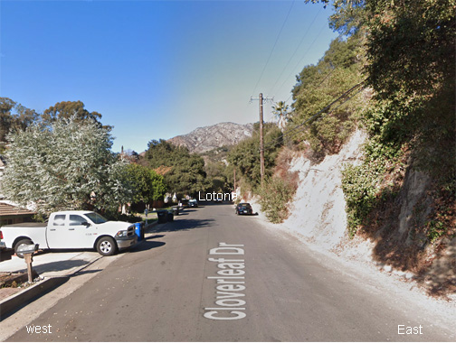 To get to the parking on Cloverleaf, take Alta Vista North from Foothill, and then left on Scenic which turns into Cloverleaf. Or, go North on Heather Heights from Scenic, park, and walk right on Lotone. Note Scenic does not connect between Cloverleaf and Alta Vista. Click above image for Map and junction .