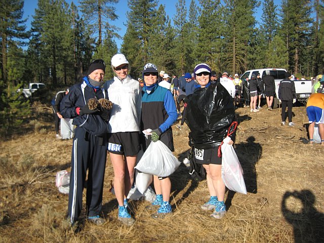 ![]() Maria Vangilder Sez of the event: Julie Millers view of this road trip event On Sunday, October 13, 2008, Flyers Karen Johnson, Julie Miller, Brenda, Jim and Tinkerbelle Terrier Thomason, Jan Iocco, Carolyn Youngberg, Leslie Hallimore, and Maria Vangilder carefully planned their ensembles for the Bizz Johnson marathon, in Susanville, CA.