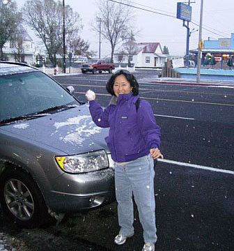 Brenda, Karen, and Julie opted for the road trip up the 395. Leaving the Santa Ana winds of LA, the girls wore sweaters and sandals while a red-flag alert along the 395 whipped tumble brush. Then snow came. Then sleet. Then the signs that said chains were required. The Susanville Best Western Trail Inn is conveniently located on Main Street close to all the local attractions and eats. Susanville is a sort of Mayberry crossed with Ridgecrest. The town is justly proud of its Southern Pacific rail trail heritage. Pre-race dinner at the Sage Hen restaurant was elegant for a pre-race dinner, and Flyers dined on chocolate fondue, creme Brule and squash soup.