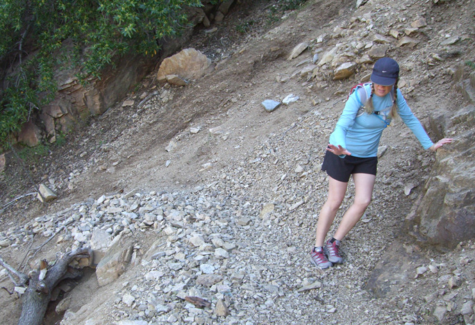 The Dawn Mine trail drops 400 ft in .7 miles and is not as well maintained as the other well traveled trails like Sunset Ridge. There are a few slide areas, but they very passable if you take it easy and are careful.