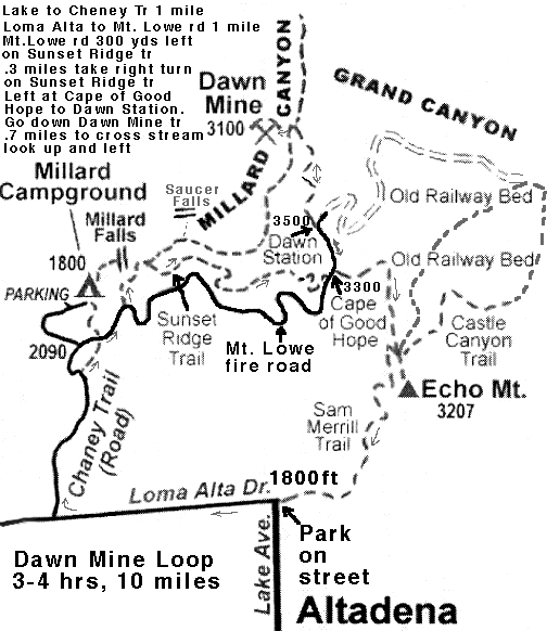 Dawn Mine Loop, Altadena If you want a little different trail run/hike adventure, then try this 10 mile loop and explore an over 100 year old abandoned gold mine. This clockwise loop takes a more runable route, but if you want to be even more adventureous, you can rock hop up Millard Canyon and about 21 stream crossings to the mine. There are some interesting alternatives, history and information at Dan's Hiking Pages.