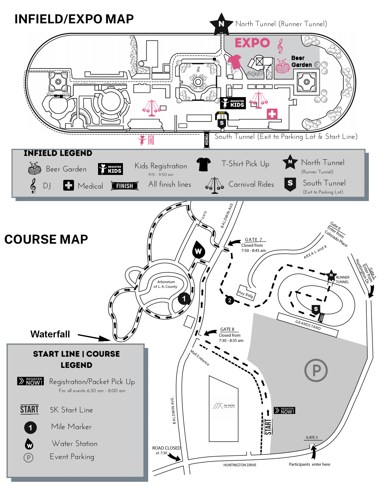 The course starts in the south parking lot of the Santa Anita Race Track parking lot and ends with the last quarter mile on the actual race track. It is listed as fast and flat, but we local runners know that Baldwin goes up hill from Huntington Drive so dont expect a 5K Personal Best. There are a number of turns and the peacocks and ducks have the right of way in the Arboretum. This is a fun and picturesque event. See the course map shown above. There are a number of activities on the Infield when you finish. If you are staying for the horse races and go back to your car to change make sure you get your hand stamped at the gate and to bring your bib number back with you.