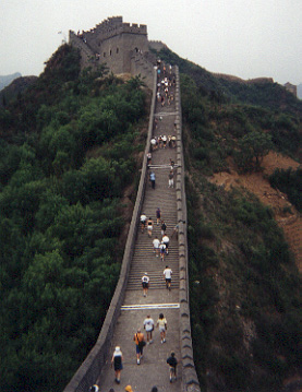 Great Wall Marathon / Half/8.5K 4th Sunday in May, Beijing, China App, itinerary and info click on Great Wall above. ![]() This is a fantastic way to see and experience China and the opportunity to run on the Great Wall and a very low cost. See Tiananmen Square and the Forbidden City just 10 minutes from your hotel. The packages start at $1750pp double occupancy for 6 days on up for 15 days with optional tours to Xian to see the Terricotta Warrior excavation, Shanghai or Yangtze River Cruise. Diana Fredlund sez: The GWM wa s a great experience, but it was very tough. We visited the Wall 2 days before the race on a trip billed as sightseeing that turned into a trial run on the Wall portion of the marathon. (Sightseeing? We left at 4 am for a 3-hour bus ride with 200+ people (20 some busses in a caravan) and ran/walked 1800 steps over a wall, had a box lunch and returned to Beijing--just a leisurely sightseeing trip?) The experience changed some people's minds about doing the full and or half marathon. On the day of the race, we left the hotel at 3 am for the same 3-hour trip. (The pit stops were quite an experience.) The start and finish for the race were in the Village Square with bleachers around 3 sides and a makeshift stage for the "dignitaries" for the opening ceremonies. There were speeches by several Chinese representatives of the town and the Danish Federation that sponsored the race (with interpreters for us foreigners who didn't speak the language.) The race started with a 5K uphill, paved, winding road past small farms and homes. I, of course, was the last of the full marathoners to reach the Wall (never fear, Diana's in the rear), but the scenery was beautiful and I enjoyed the people and animals (goats, dogs, chickens) along the route up. The weather was clear, not so hot and beautiful blue sky--you could see forever! The birds were calling me "Cuckoo, Cuckoo". The first trip over the Wall was not so bad as my adrenaline was flowing and the excitement of being on the Great Wall was keeping my mind off the 1800 steps. Since I'm a "walker" the pace was normal for me. Then came the flat--20 miles of dirt roads and streets through several small villages, lined with people doing their Saturday shopping and staring at the crazy people running through their streets. Many called "Halloe" and kids high-fived, lots of smiles and giggles when I tried the one Chinese word I knew. One even asked for my autograph (only charged him $1). ![]() The course was very flat, dusty and hot. There were frequent and well-stocked aid stations and friendly workers to chat with as we passed. The second time over the Wall was in the opposite direction, which meant long, very steep, winding, steps facing us after 21 miles. I met Tom O'Hara on the way up the very steep, long, winding steps and we huffed and puffed our way over the rest of the wall finishing together. We planned it right--we were able to enjoy the beautiful scenery and the wall without other runners cluttering our view. And we had the aid stations all to ourselves and the workers were extra friendly (probably because they could go home soon), except for the one who was stretched out on a gurney sound asleep. The last 5K was the (now) downhill paved road back to the Village Square, which was anticlimactic after the rest of the race. Tom and I crossed the finish together--I was (and probably never will be again) so happy to see the finish line, all dusty, hot, sunburned and with a big smile! WE FINISHED! |