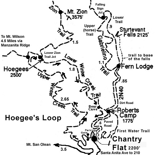 The clock-wise run as shown on the map has all right turns at trail junctions. From the Upper Parking lot, go west up the paved road past the gate. Watch for the Upper Winter Creek Trail head sign on your right at a left hairpin turn about a quarter mile up. This single track trail winds in and out of canyons on the Upper Winter Creek trail for a little over 2 miles to the junction down the Lower Winter Creek trail to the Mt. Zion trail junction and Hoegee's camp. Go through Hoegee's Camp and down past cabins on the trial following the stream under a canopy of trees. There are about 10 stream crossings as you decend down the Lower Winter Creek trail, most are rock hoppable. Check out the bear cave just before reaching Roberts Camp. At Roberts, return to Chantry by crossing the bridge and on up the paved road. Click on the map if you want to print it out to take with you. If you prefer, you can do the loop counter clockwise and end with 2 miles of down hill rather than .6 of uphill. Directions: |