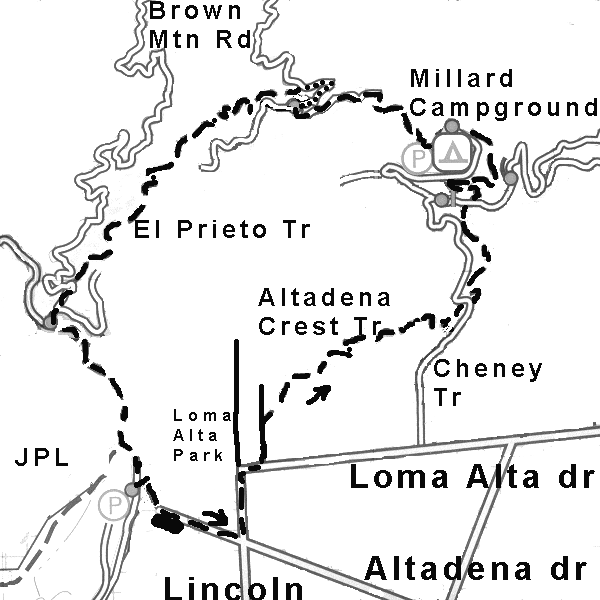 Last update march 21, 2009 Millard Loop from west end of Altadena Dr 6.6 Mile loop going up the Altadena Crest trail from Loma Alta Park to Millard Campground. Then up the lower Brown Mountain road to the El Prieto Trail. At the bottom of the El Prieto trail, take the bottom of the Brown Mountain road to return to Altadena dr down the San Gabrielino trail. |