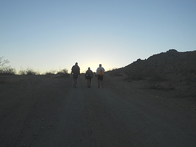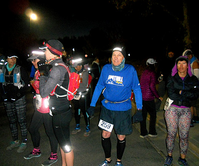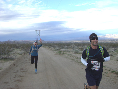 Trying to be a good-guy, I didn't drop my empty water bottle in the desert. But I also forgot to drop it at the first aid station! I had to go back about 100 yards, and got razzed about running the wrong way by the good natured aid people. Aid was wonderful: friendly, plentiful, and good stuff.