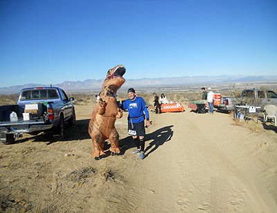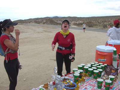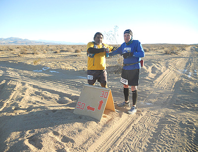 Anibal Corsi's experience with the 2008 race Hello runners! Before it gets any later, I want to share my experience at the Ridgecrest 50K last Sunday, 12/7/08. I started my race slow but I warmed up fast with the excitement of the race and the spectacular views of the high desert. The temps were in the high 40s yet it dropped some during the race. I don't know how low the temperature fell, but it was too cold to where I regretted turning in my sweater and gloves at mile 5 and then getting really cold. At one point, I didn't want to walk because I was afraid of freezing. So I kept moving. This helped me with my time at the end. I would have preferred a temp in the 50s, but I'm getting use to not having what I want in my races. You can tell I'm new to this stuff and still sane. The course was openly beautiful with small rolling hills and a total elevation gain of only 2,540 feet. I had not trained for this race due to lack of time and plantar fasciatis in the last 2-3 months leading to the race. You know, excuses, excuses. To make things worse, a congested chest and sore throat during the week made me plan on just showing up to pick up my race packet and run 10 miles to get a taste of the "Friendliest 50K course." I drove the morning before the race and I planned on driving back after it. I thought to myself, "Driving back and for after the race is not as tough as a 100 miler," which I've never and I am scared of getting that insane to where I would attempt it. In the back of my mind, I was hoping that all the time off from running would favor me with rested legs and in a worse case scenario of a bad weather, I would just drive myself straight to Kaiser if pneumonia hit me. As my son says, "It's always good to have a back up plan, Dad." Thank God none of this was necessary and I enjoyed every stretch of the course. I was happy with my time of 6:38:40 hours which could've been much worse not being for the help I received from a runner I met at the course. Her name is Karen C. Johnson from the Foothill Flyers. I want to send a special thanks to Karen for her kindness at mile 22. I had stopped to stretch my tight muscles with cramps in calves, quads and hamstrings. You name it, it was cramping too. Karen didn't do the usual, "Are you okay?" and kept going as most of us, she actually stopped and offered something to alleviate those cramps that were making me consider a DNF (did not finish). She offered Tums! What a great idea! And right on target. If you know you've been drinking enough fluids (does beer count? 'cause they had it at the stations), you've been taking enough sodium, you've been running the course at different speeds, and you're still cramping, you might be lacking calcium! I never thought of that, but indeed. The Tums worked wonders on my legs. I felt as I've got new legs, and I ran mile 31 three minutes faster than my average that race. Thank you, thank you Karen! You were my hero for