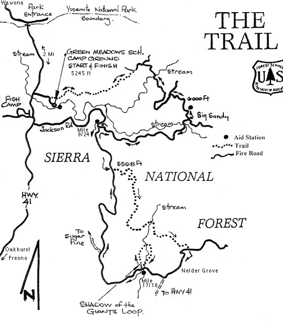 The Course: Scenic historic trails through the Sierra National Forest. The run takes you past 2700 year old Giant Sequoias in the famous Nelder Grove. The Fun Run loop is actually 15K, and the 50K is actually a little less than 33 miles, but who's counting? Elevation is 5,000 - 6,500 ft. About 2/3 of the course is on jeep roads and the rest on single track trails all in the forest. Finish time limit is 8 hours with a cut off at 1:20 PM at the Jackson Rd 24 mile aid station. Like most trail ultra's, you need to pack water and enegry food as it can get warm and the aid stations are some miles apart. Pets are not allowed on the trail, so please leave your doggies at home!