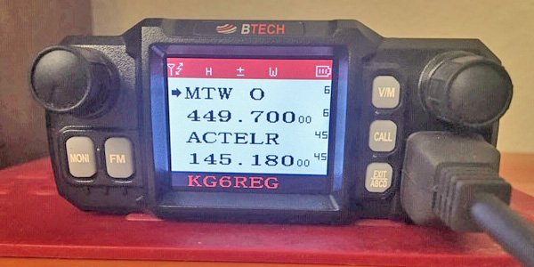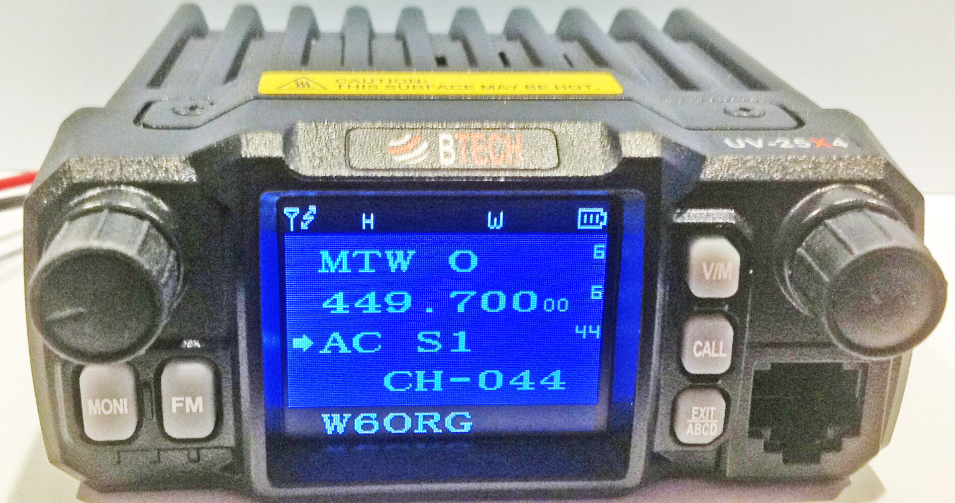 The Btech UV-25X4 tri-band mobile transceiver makes a nice base station transceiver - Review. While it is small - 3.85 (w) x 1.38 (h) x 4.65 (d) in, weighing 1 lb - it packs a lot of features. The 25 Watts transmit power on 146 MHz and 20 Watts on the 446 and 223 MHz bands will let you work just about any repeater you can hear, and more than enough to talk to those with walkie talkies on simplex. If you want to transmit in the 223 MHz band, you will need a tri-band antenna, or just stick with 146 and 446 MHz with a dual band antenna. We recommend running half inch low loss coax from the antenna to the back of the radio such as 9913 or LMR-400. If your coax has N plugs, you will need a N female to UHF male adaptor as the radio has a UHF SO-239 antenna jack. Never transmit without a proper antenna connected.