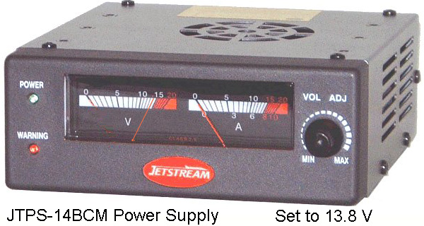 Power Supply - In place of being powered by the car electrical system, you will need to connect a 13.8 Vdc power supply. The black lead from the transceiver goes to the negative or ground terminal and the red lead goes to the plus or positive terminal. Double check your connection, you don't want to reverse it. The example shown right is the Jetstream JTPS-14BCM rated 12 Amp continuous DC power supply which is ample for the nominal 5 Amp current draw of the UV-25X4 in transmit, and it has terminals for optionally charging a back up car battery in case of AC power failure. The VOL ADJ knob on the front sets the DC Voltage, not volume. Make sure it is set to just a hair below the 14 mark on the Voltmeter. The on/off switch is located on the back of this power supply and can be used solely to turn your radio on and off rather than also push and holding the volume control knob on the left of the radio.