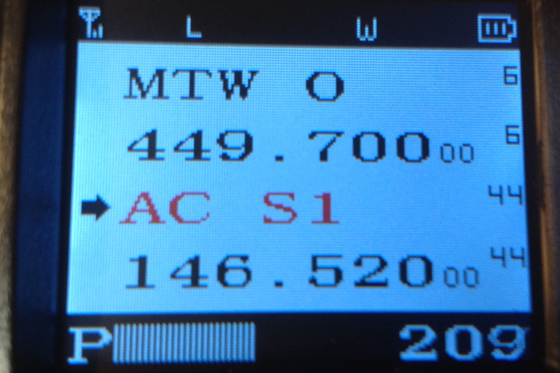 Transmit Deviation Meter - Shown is the (P - power) bar graph while transmitting with the low power setting. Note the L in the upper bar. If set for high power, the bar graph is full across. Another surprising plus for this radio is the number on the far right. The number actually indicates the amount of FM deviation. Shown is 209 which tested out to be 2.09 kHz deviation. It will vary with your mic audio volume. If you hit above 400 you are probably too close to the mic or speaking too loud. 200 - 300 would be a desired normal average.