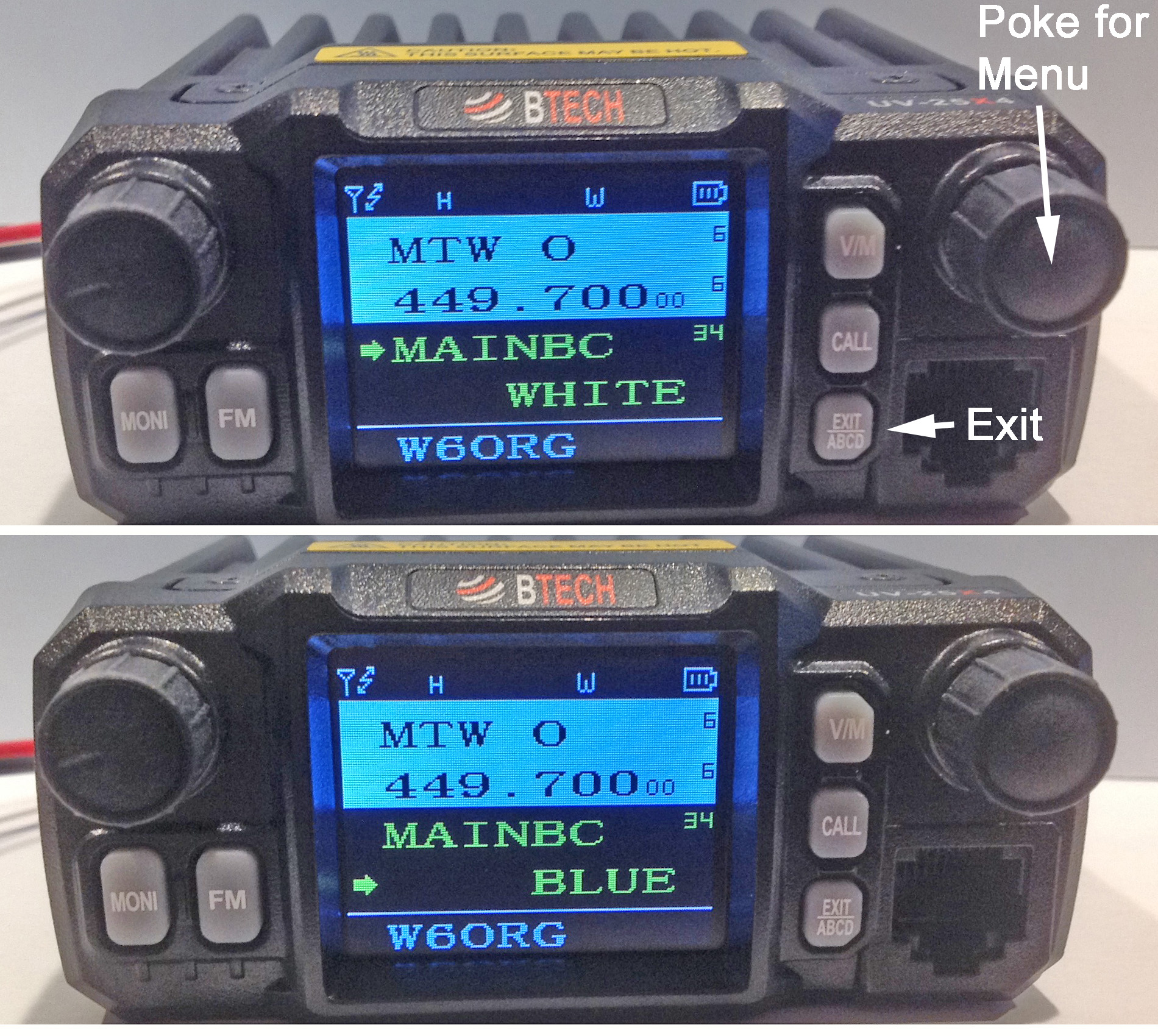 Your radio likely came with the center 4 line ABCD display having black text over a white background. For me, I found that a blue back ground with white lettering showed up best, especially the small channel numbers on the far right so that combination will be our example. You may prefer white on black or have fun trying various combinations. Your choices are black, white, red, blue, green, yellow, indigo, purple and gray. Note that the radio will not let you blank out the display by using the same color for text and background.