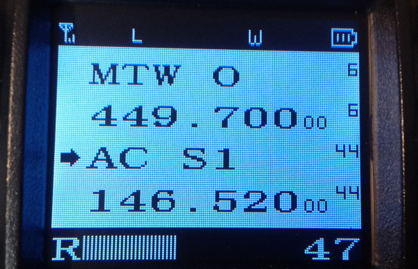 S-Meter - When a station is received (R), the display changes to an S-Meter or signal strength meter. As the signal is stronger the bar graph expands to the right and there is a number on the far right. The bar graph is very handy for finding a magic spot for an antenna or to tell you something about changing atmospheric conditions. The number gives the relative signal strength, but surprisingly, each successive digit represents about a 1 dB change. This helpful to compare antenna efficiencies, peaking directional antennas and other transmission variables. No signal on 146.520 MHz with un-squelched noise (MONI) read 21. Shown is 47 which tested out to be a 1 microvolt or -107 dBm signal. The numbers will vary radio to radio and band to band.